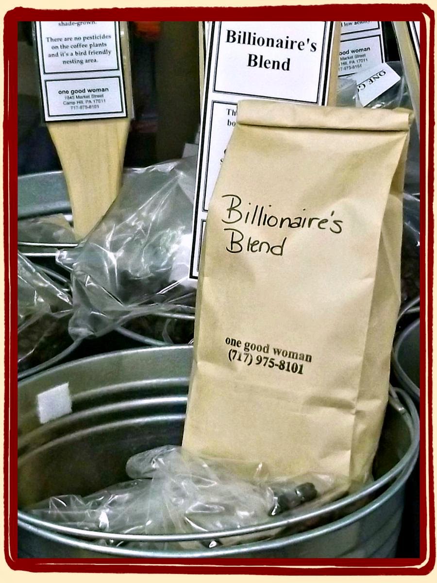 “Billionaire’s Blend” is a premium coffee created by Holly O’Connor of One Good Woman Fine Coffees and Teas and her master roaster Shane in honor of my visit to their store in Eastern PA, along with my partner in crime-writing, my husband Marc.